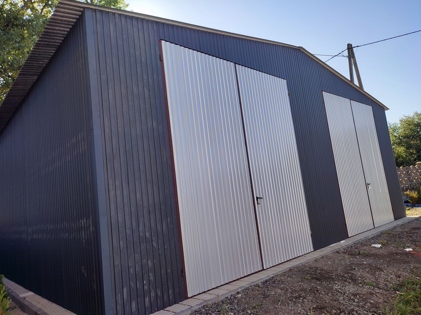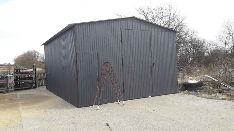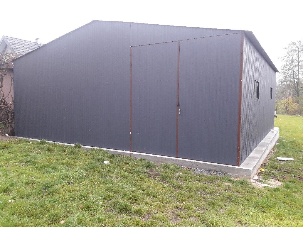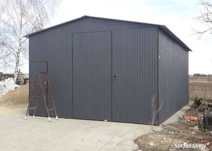 Garażu blaszanego o wymiarach 8x8m z dachem dwuspadowym.