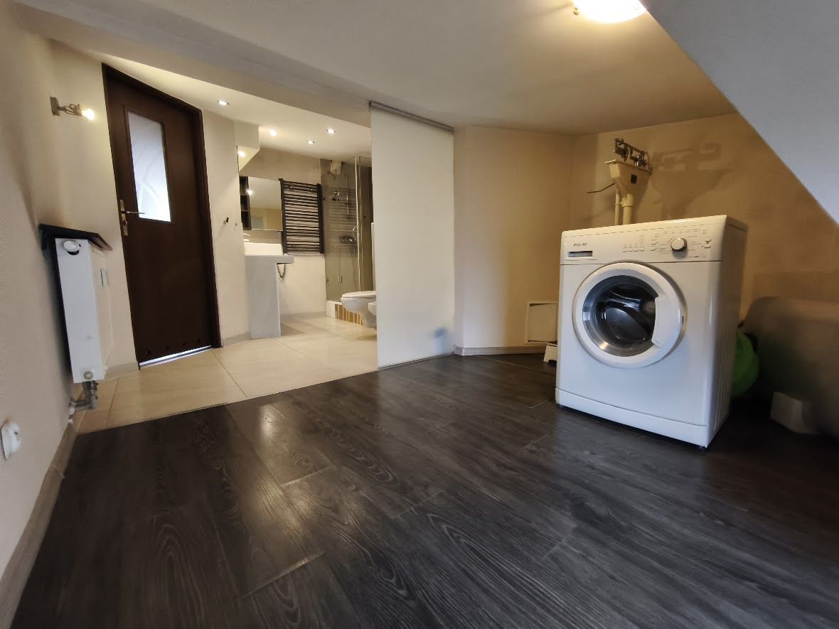 - Łazienka z oknem, prysznic, umywalka w blacie, bidet, wydzielone osobne miejsce na pralnię.