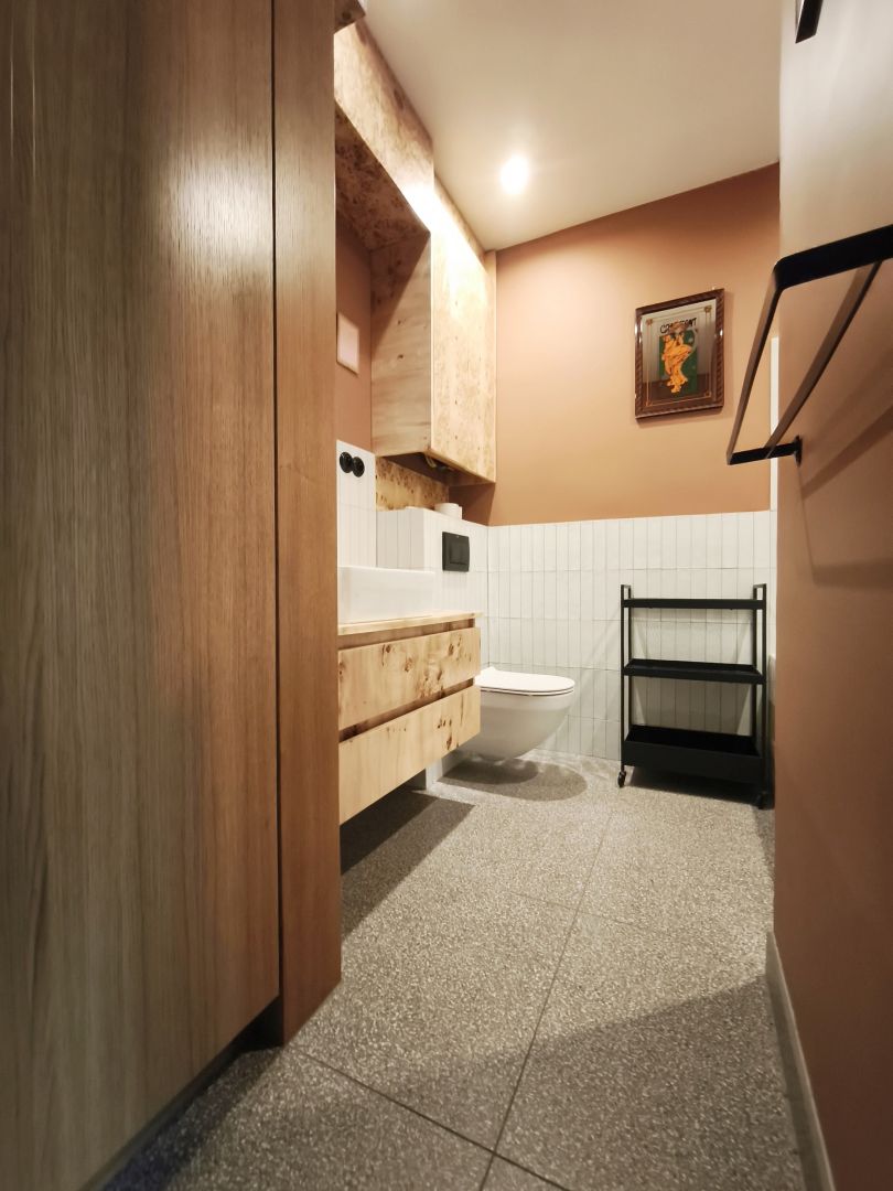 Łazienka: Nowoczesna, połączona z WC, wykończona wysokiej jakości materiałami.