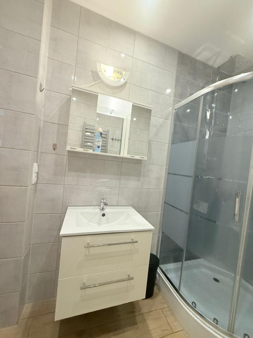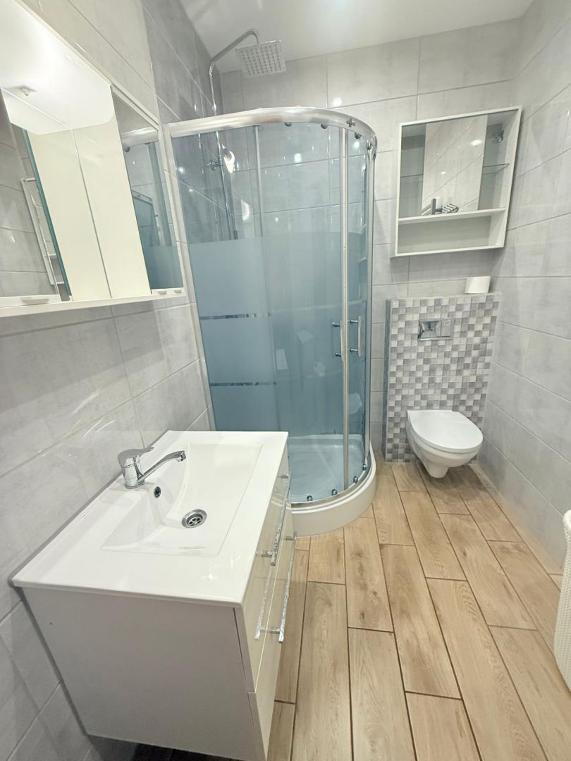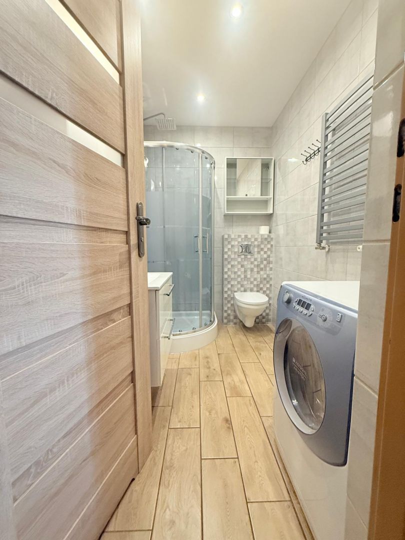 W łazience: kabina prysznicowa, umywalka z szafką, toaleta, pralka.