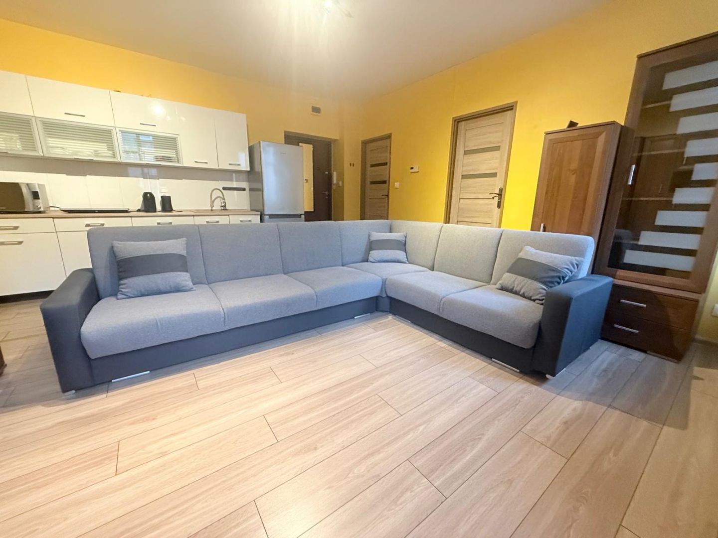 W kuchni: meble kuchenne, płyta indukcyjna, mikrofalówka, lodówka.