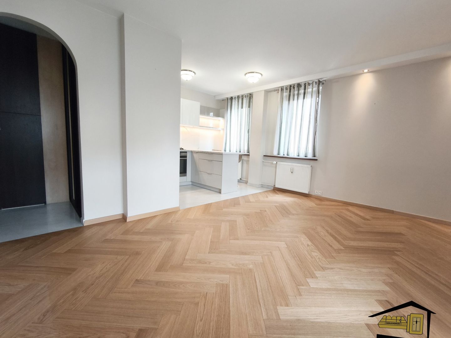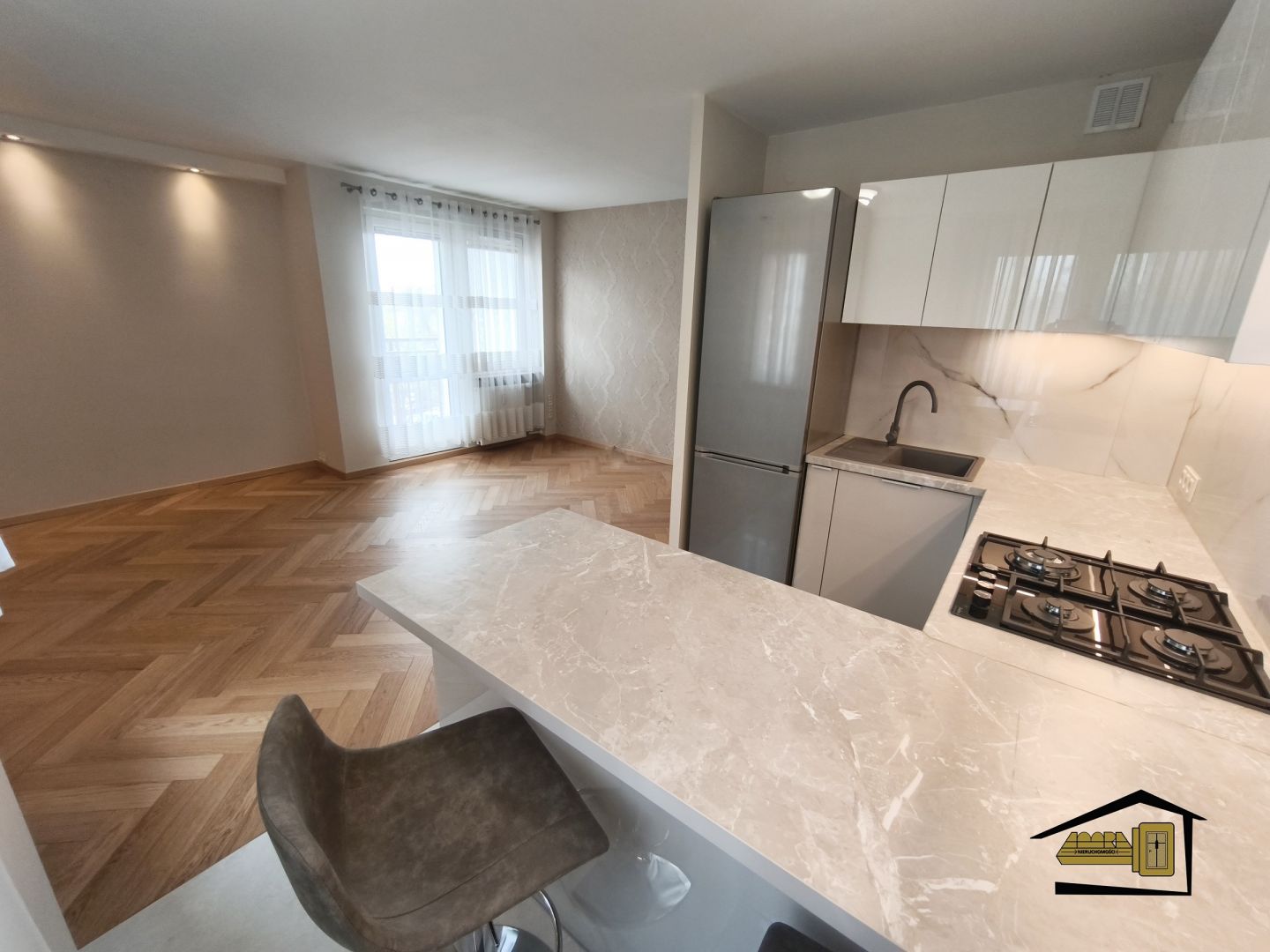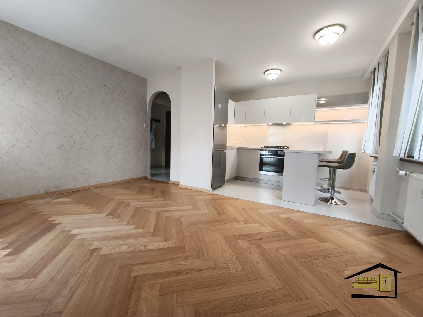 Salon z aneksem kuchennym: Kuchnia w pełni umeblowana, zaprojektowana w sposób funkcjonalny. Na podłodze w salonie znajduje się szlachetny parkiet dębowy.