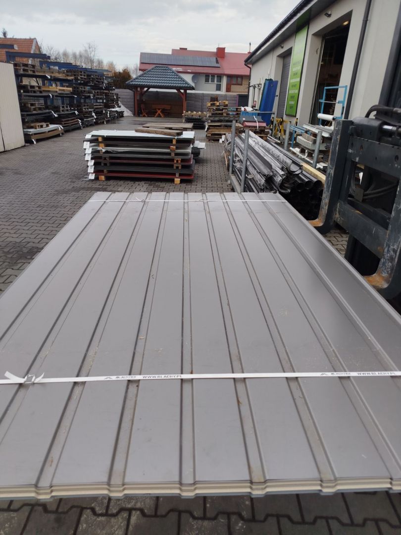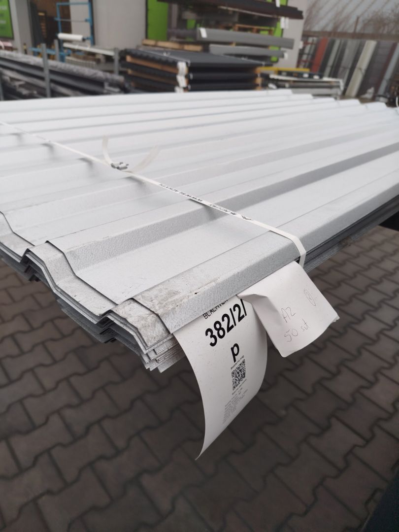 Na sprzedaż blacha trapezowa II gatunku (towar z wadami powłoki) — paczki po ok. 50 arkuszy, łączna powierzchnia pakietu ok. 114 m².